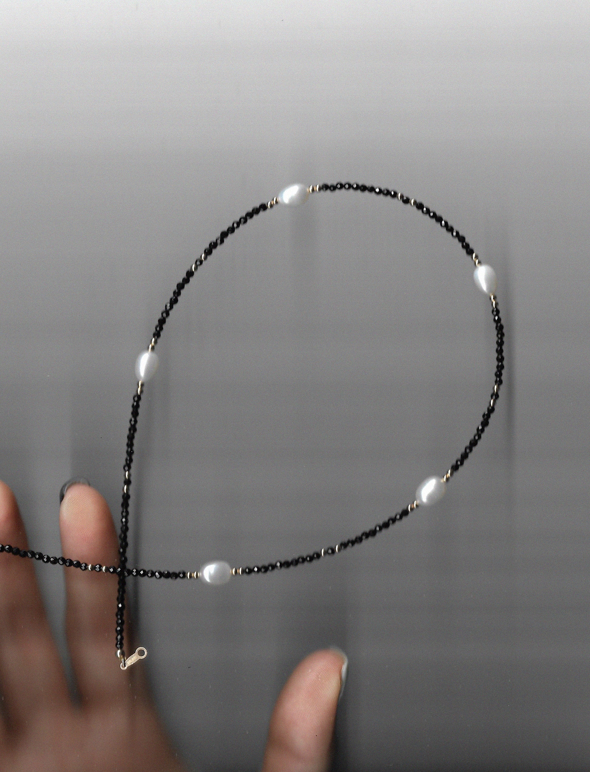 Edgy blend of black crystals with 6mm freshwater pearls. 40cm or 45cm in length finished with 14k gold plated 925 sterling silver hardware.