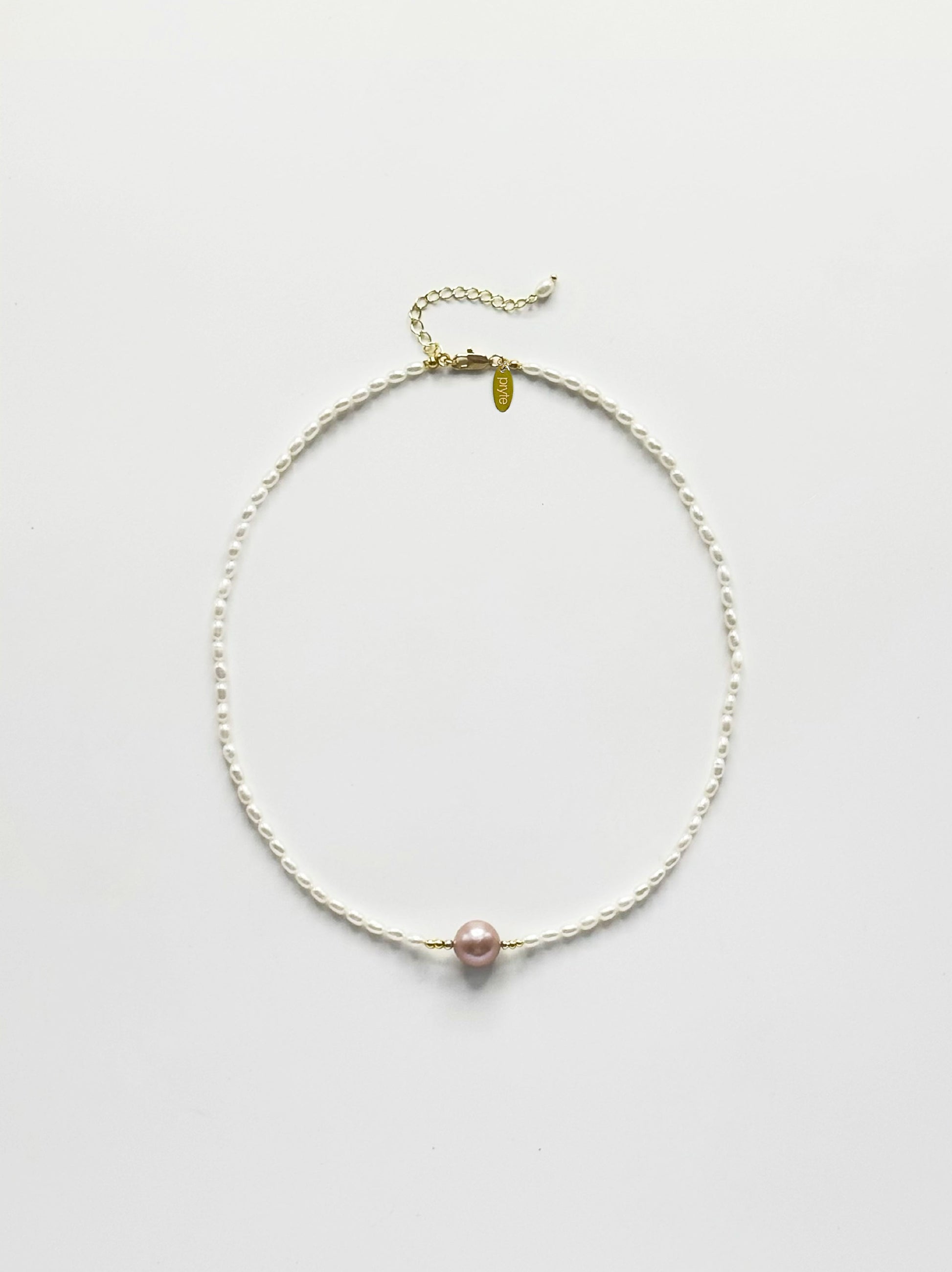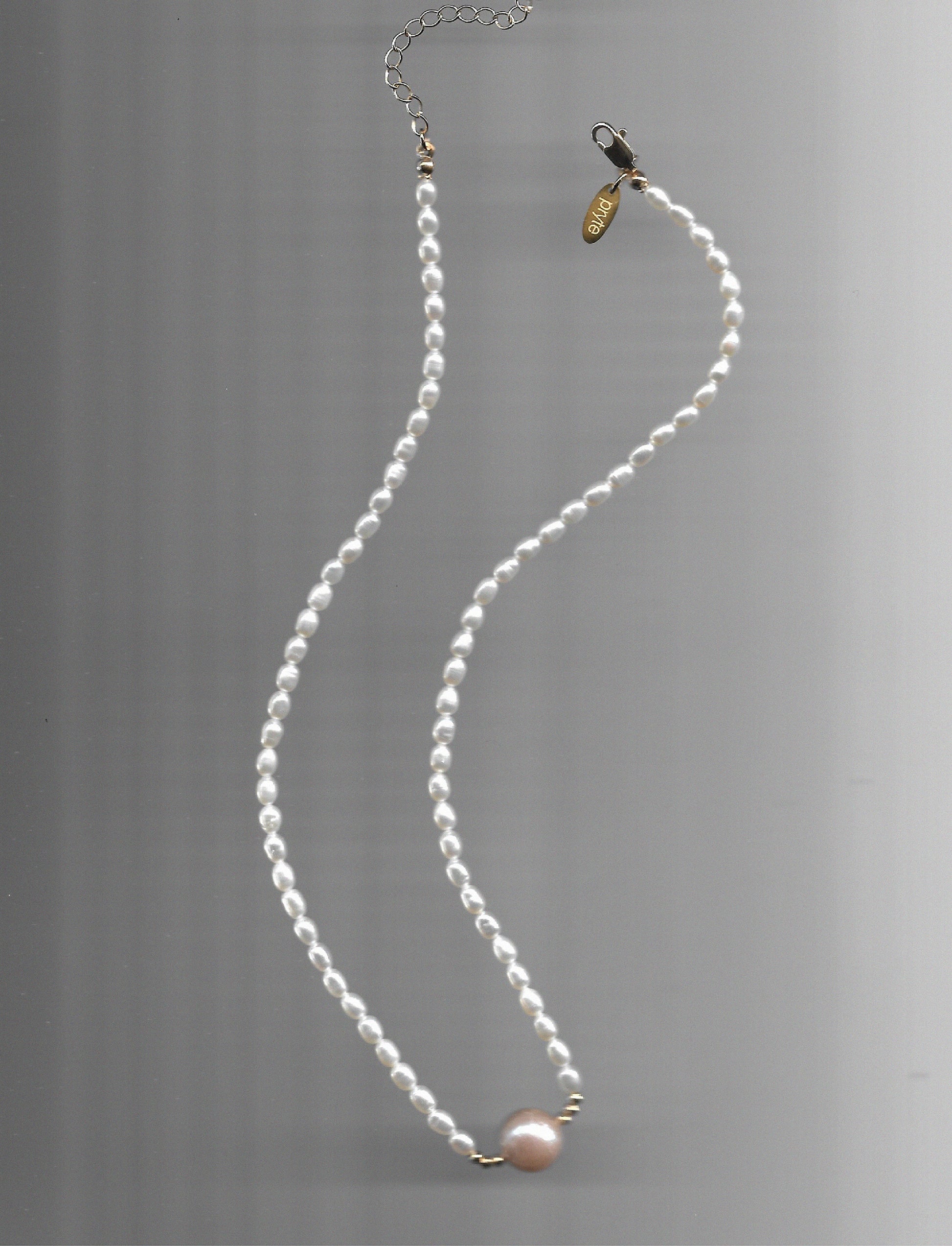 Elegant rice shaped 4mm-5mm freshwater pearls combined with a natural purple 9mm freshwater pearl 38cm-44cm in length finished with 14k gold plated 925 sterling silver hardware.